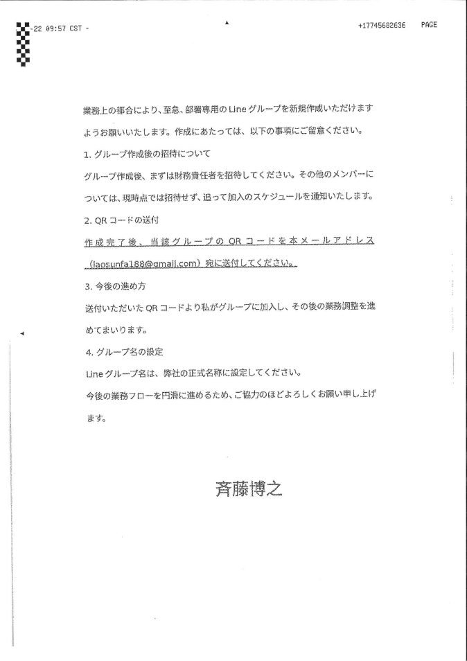 現在、弊社代表取締役 斉藤博之を騙ったLINEグループの作成を求める迷惑メール・メッセージが発信されている事実を確認しておりますが、新たに弊社 北海道物流開発㈱札幌支店に本日9時57分に直接迷惑FAXが届きました。これらは弊社とは一切関係なく、弊社代表者含め個別にLINEグループの作成をお願いすることはございません。